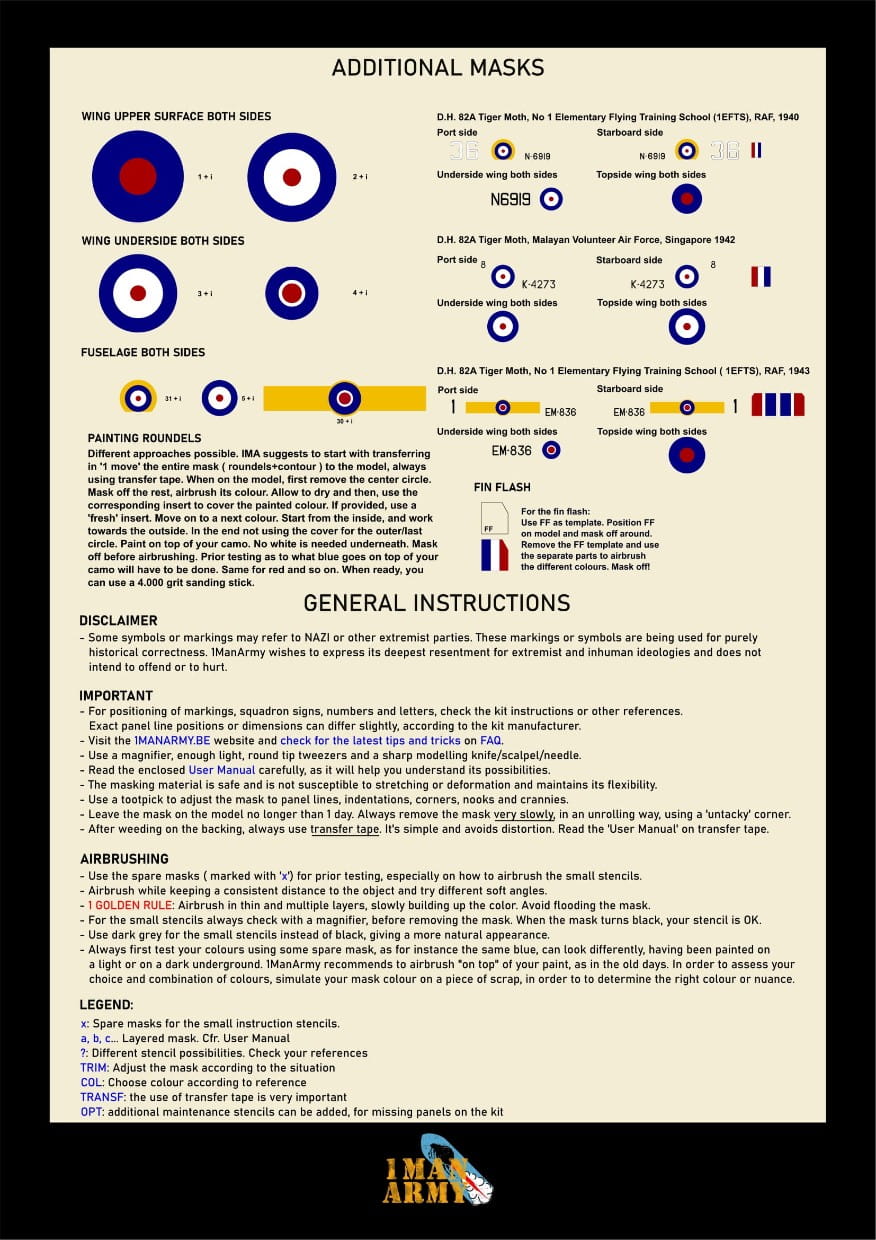 Zestaw 1 Man Army 32DET045 to komplet bardzo precyzyjnych masek do malowania oznaczeń samolotu de Havilland D.H.82A Tiger Moth w skali 1:32, przeznaczony do plastikowego modelu firmy ICM. Maski umożliwiają wykonanie oznaczeń narodowościowych, kodów szkolnych, numerów seryjnych oraz wybranych napisów eksploatacyjnych bez użycia kalkomanii.
