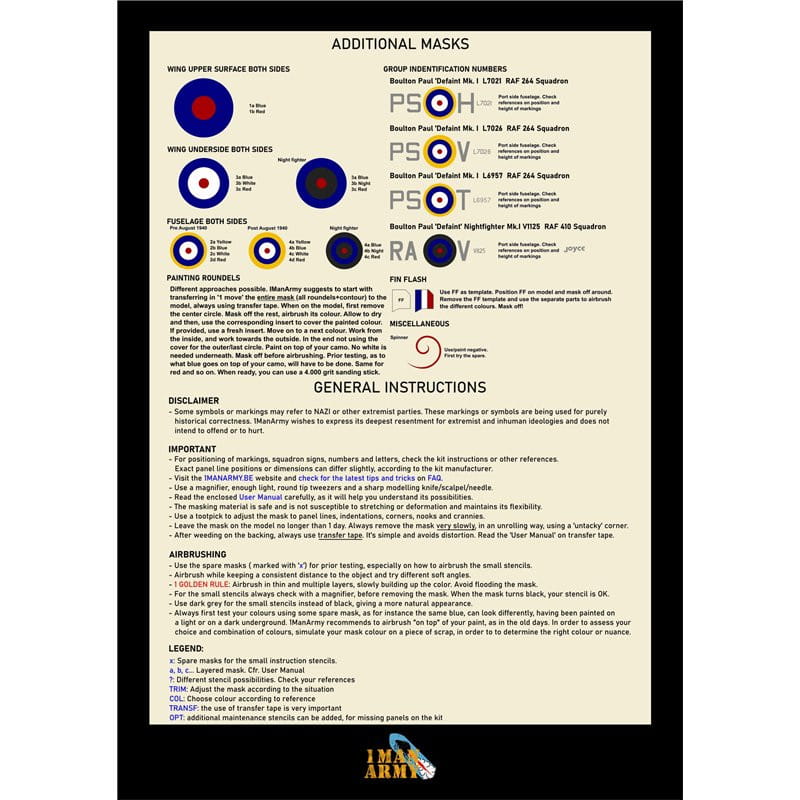 Zestaw 1 Man Army 32DET046 zawiera precyzyjnie wycinane maski przeznaczone do modelu samolotu Boulton Paul Defiant w skali 1:32. Maski umożliwiają dokładne odtworzenie oznaczeń i detali malowania, które trudno byłoby uzyskać przy użyciu kalkomanii. Dzięki nim model zyskuje realistyczny wygląd oraz ostre i czyste krawędzie malowanych elementów.