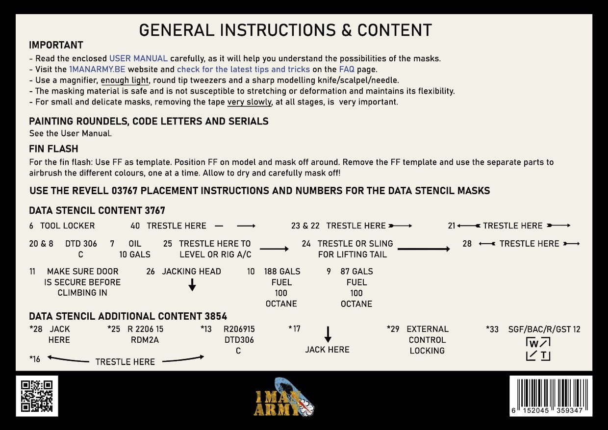 Zestaw 1 Man Army 48KIT005 to komplet bardzo precyzyjnych masek do malowania oznaczeń samolotu Bristol Beaufighter Mk.VI / IF w skali 1:48, przeznaczony do plastikowego modelu firmy Revell. Maski umożliwiają wykonanie oznaczeń narodowościowych, kodów jednostek, numerów seryjnych oraz wybranych napisów eksploatacyjnych bez użycia kalkomanii.