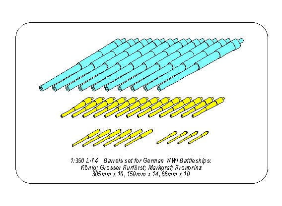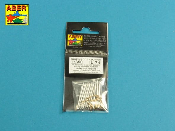 ABER 1:350L-74 - 1:350 Barrels set for German WWI Battleships, Konig, Grosser, Kurfurst, Markgraf, Kronprinz 305 mm x10, 150 mm x 14, 88 mm x 10