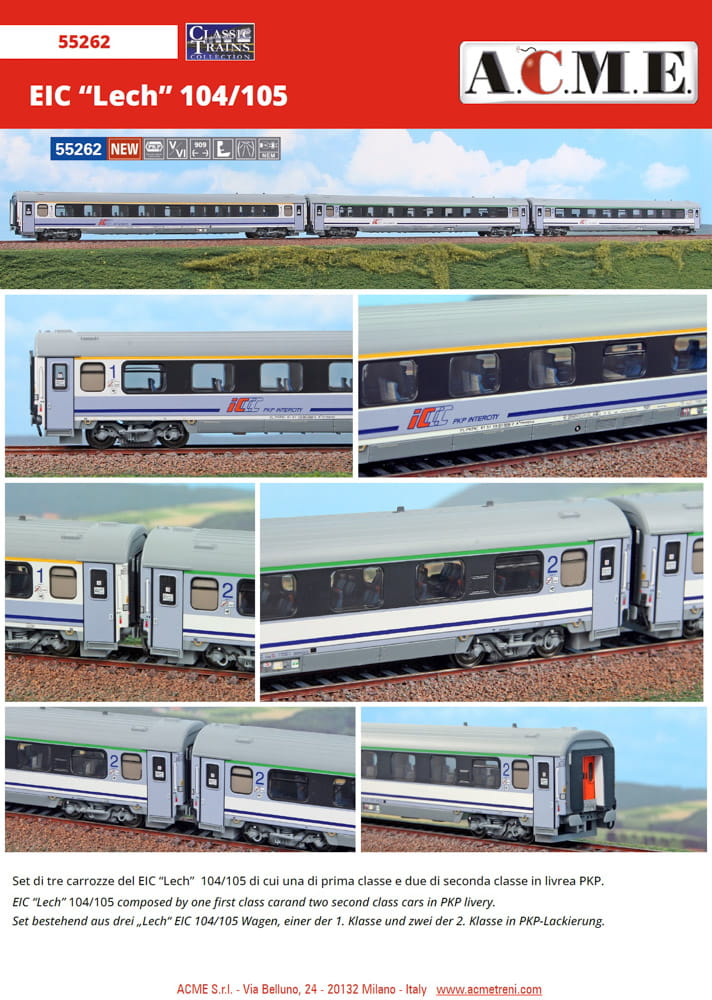 Wykonane z elementów plastikowych i metalowych modele wagonów do kolejek elektrycznych w skali H0 czyli 1/87. Są miniaturami wagonów pasażerskich pociągu EIC Lech. Malowanie przedstawia wagony używane przez spółkę PKP Intercity w trakcie epoki V i VI przypadającej na lata od 1990 roku do dziś.