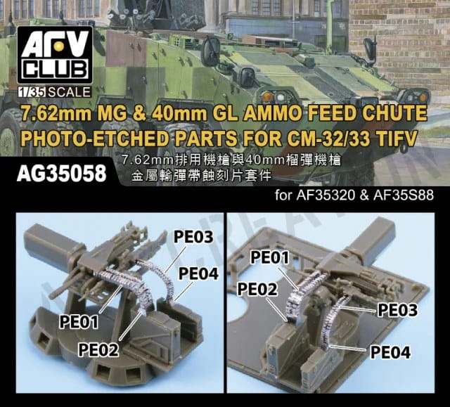 AFV Club AG35058 to precyzyjny komplet części fototrawionych zaprojektowany jako ulepszenie wnętrza stanowisk uzbrojenia w modelach CM-32 i CM-33 TIFV w skali 1:35. Zestaw odwzorowuje kanały podawania amunicji i prowadnice do karabinu maszynowego 7,62 mm oraz granatnika 40 mm, dodając realizmu modelowi i oferując wyższy poziom detalu niż standardowe elementy plastikowe.
