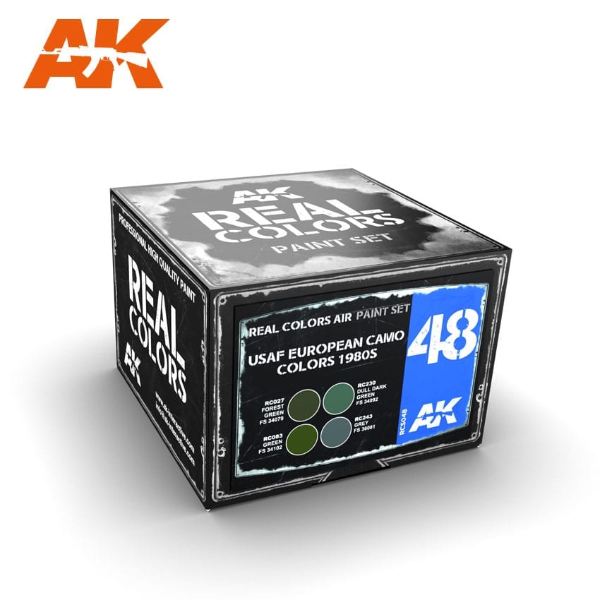 Zestaw farb akrylowych na bazie rozpuszczalników organicznych firmy AK Interactive seria Real Colors RCS048 USAF European Camo Colors 1980s - kolory do samolotów amerykańskich stacjonujących w Europie w latach 80-tych.