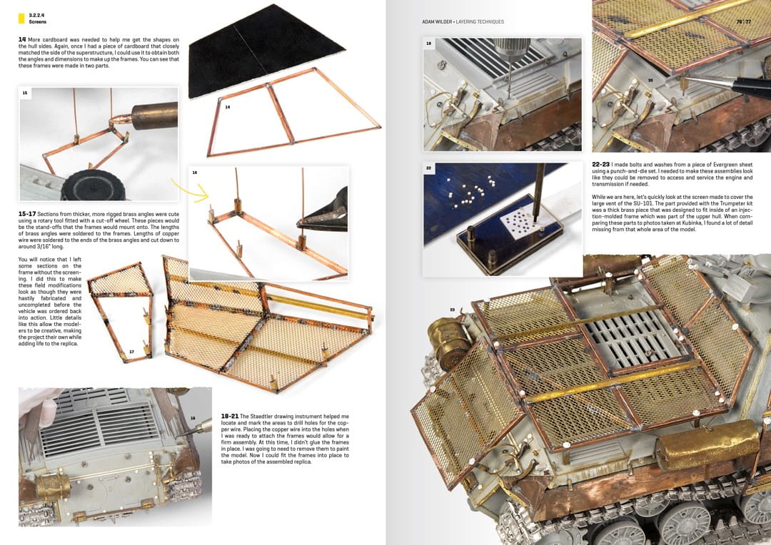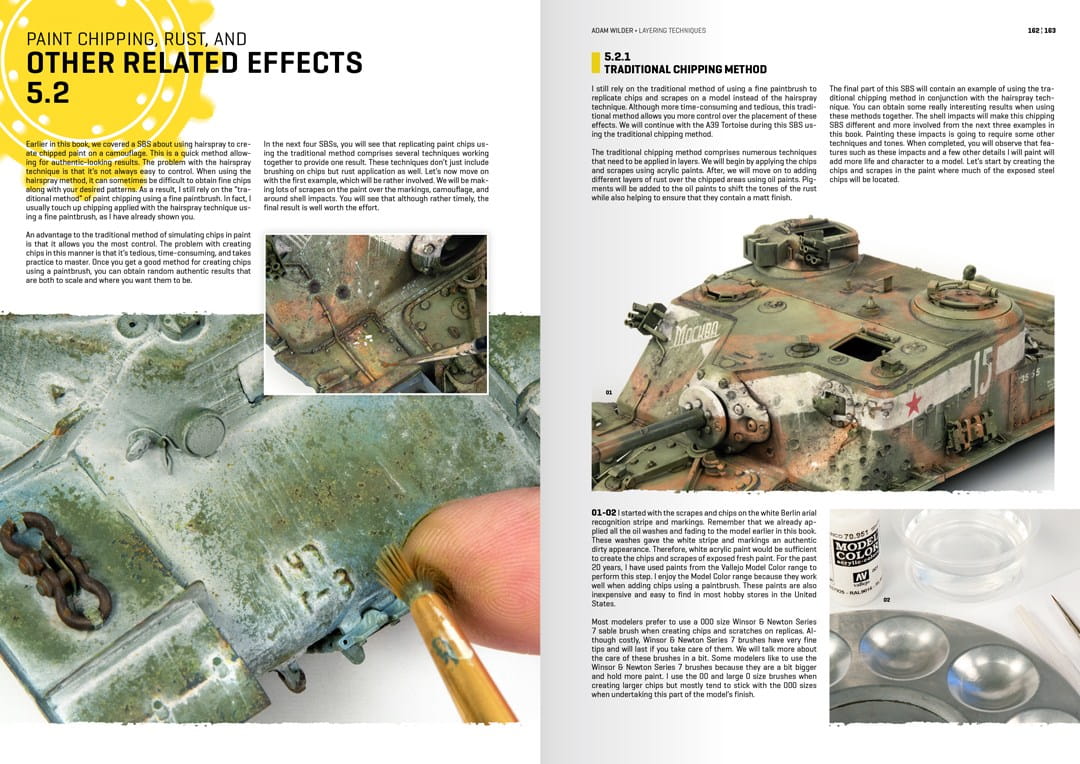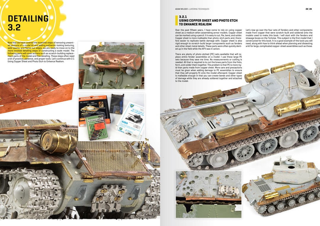W tej książce Adam pokaże, w jaki sposób warstwy pozwalają modelarzowi uzyskać znacznie bardziej uderzający, realistycznie wyglądający efekt. Czytelnik zobaczy liczne zdjęcia krok po kroku i towarzyszący im tekst, w jaki sposób Adam wykorzystuje te warstwy do pokazania i wyjaśnienia swoich szczegółowych metod montażu i technik malowania podczas modelowania opancerzonych pojazdów bojowych. Kroki przedstawione w tej książce będą przydatnym przewodnikiem dla wszystkich typów modelarzy, obejmującym etapy budowy, super-detalowania, malowania i weatheringu modelu pancernego. Adam uwielbia efekty i szczegóły, które można uchwycić w modelarstwie pancernym w skali 1/35. W tym tomie wykorzystuje cztery modele, wraz z ich wyposażeniem i członkami załogi, jako podstawę do wyjaśnienia swoich metod nakładania warstw. Każdy zainteresowany modelarstwem pancernym zrozumie, jak odtworzyć te ponadczasowe techniki. Wszyscy wiemy, że różne środowiska i teren wpływają na wygląd poruszających się w nich pojazdów. Dlatego charakterystyka planowanego terenu jest bardzo ważna podczas starzenia opancerzonych pojazdów bojowych. Pora roku, w której replika ma się znajdować, pozwala nam na wykorzystanie żywiołów ziemi, wody, powietrza, a nawet ognia, aby uzyskać abstrakcyjną sekwencję tekstur i odcieni. Te tekstury i odcienie pomagają nam dodać zarówno uczucie, jak i głębię do modelu, pozwalając na zaprezentowanie efektów w każdym zakątku i na każdym szczególe, tworząc gotowy rezultat, który sprawia, że my i inni chcemy się zatrzymać, obserwować i cieszyć się raz po raz. Ta książka to pozycja obowiązkowa dla każdego, kto interesuje się modelarstwem pancernym.