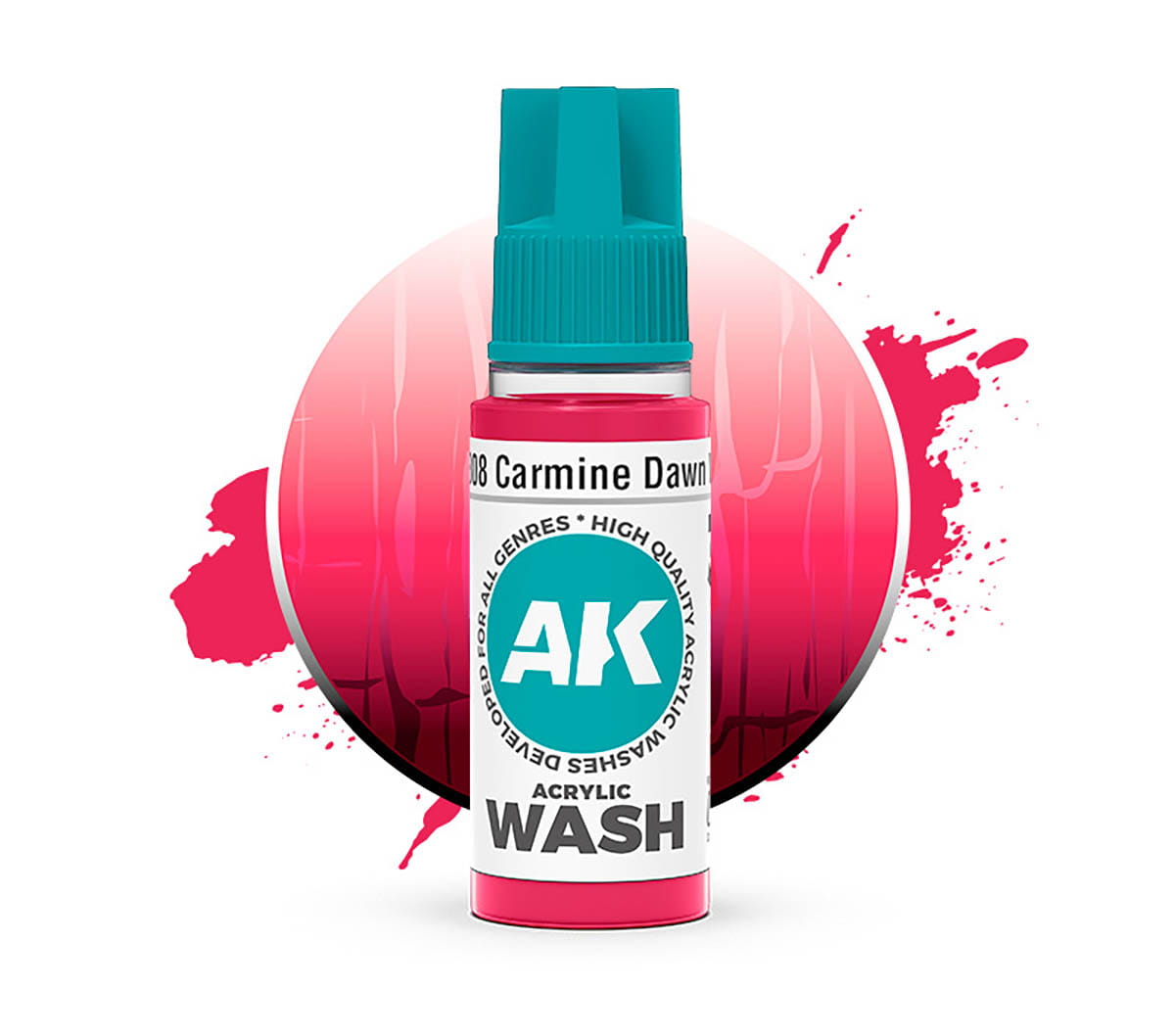 AK Interactive 19308 Carmine Dawn to półprzezroczysty wash akrylowy w ciepłym, karminowym odcieniu czerwieni, zaprojektowany do nadawania cieni, głębi oraz płynnych przejść tonalnych na powierzchniach w czerwonej i pokrewnej, ciepłej kolorystyce.
