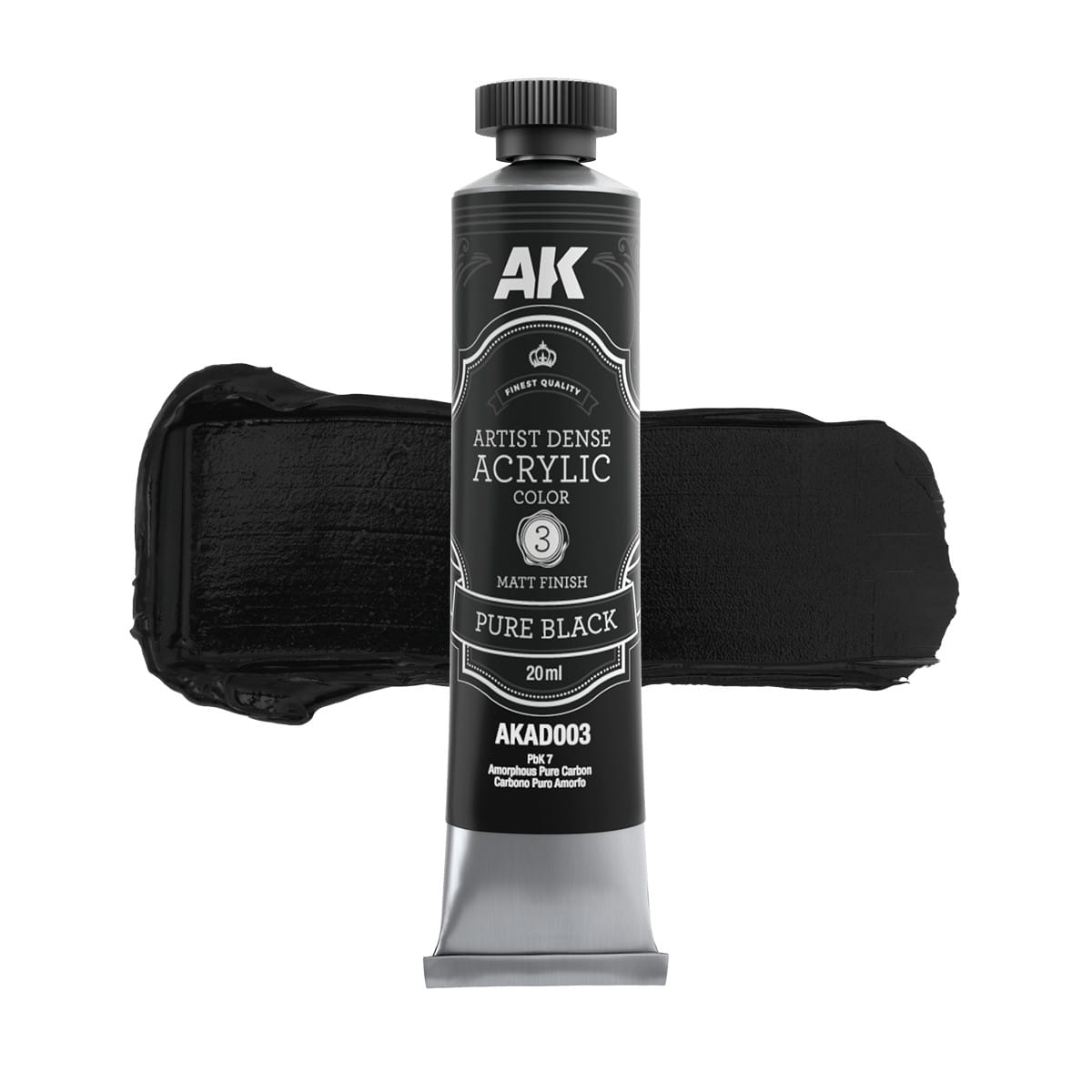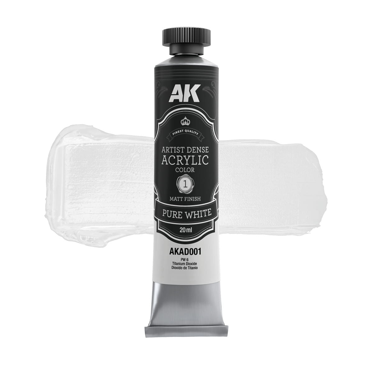 Charakteryzują się one specjalną formułą pozwalającą uzyskać bardziej matowe wykończenia i bardzo płynne przejścia dzięki świetnej jakości pigmentom. Farba akrylowa jest wykonana z wyselekcjonowanych mikropigmentów o najwyższej czystości i intensywności rozpuszczonych w akrylowej bazie emulsyjnej kompatybilnej ze wszystkimi dodatkami do farb akrylowych. Oferuje żywe i świetliste odcienie specjalnie zaprojektowana dla najbardziej wymagających malarzy figurek poszukujących najwyższej jakości wykończenia. AK's Dense Artistic Colors mają również zastosowanie w sztukach pięknych, takich jak malowanie na płótnie, drewnie czy papierze. Łączą krótki czas schnięcia z gładkim wykończeniem i nieskończonymi możliwościami akryli. Zalecane dla zaawansowanych malarzy. Świetnie sprawdzają się w technikach polegających na nakładaniu wielu warstw. Gama kolorów pokrywa podstawowe potrzeby artystów i modelarzy. Inne kolory można uzyskać mieszając farby. Ich matowe wykończenie sprawia, że są idealne do malowania figurek i detali, nawet dla najbardziej wymagających malarzy poszukujących najwyższej jakości wykończenia.