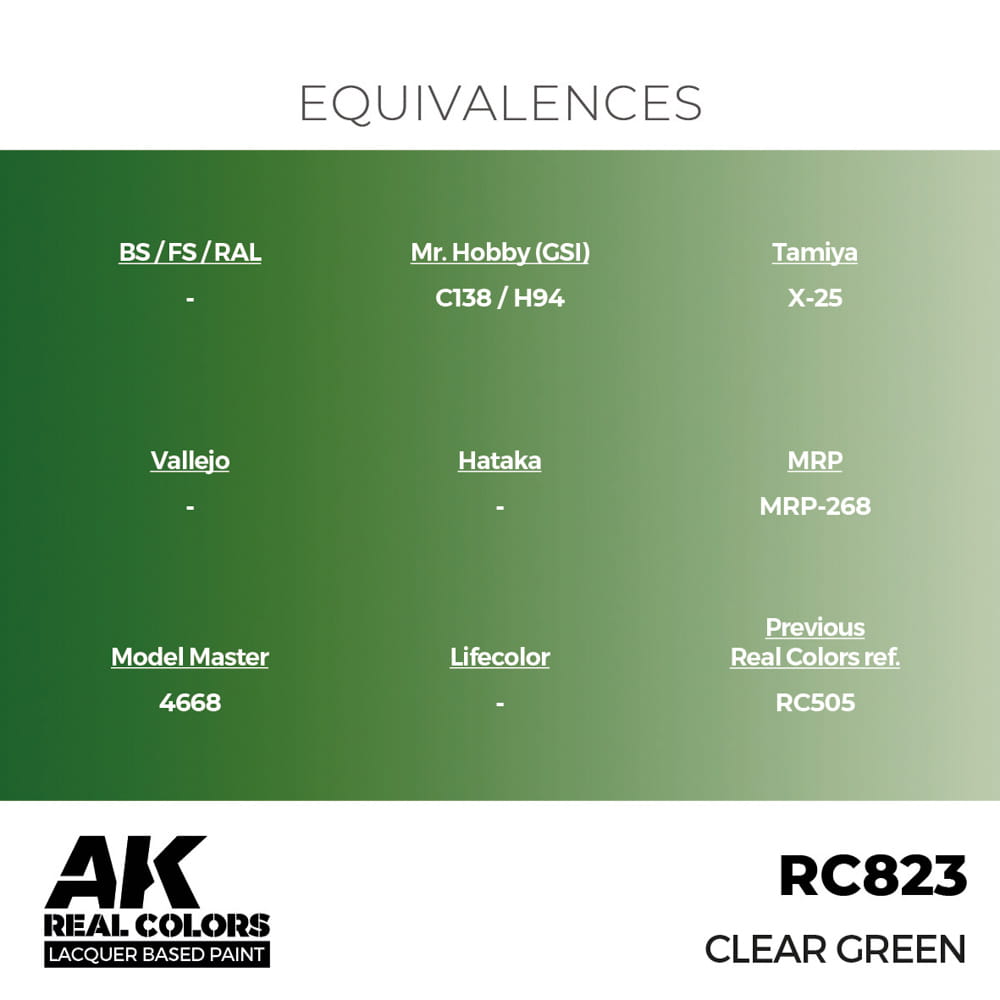 Farba akrylowa na bazie rozpuszczalników organicznych firmy AK Interactive seria Real Colors - kolor RC823 Clear Green - Transparetny zielony.