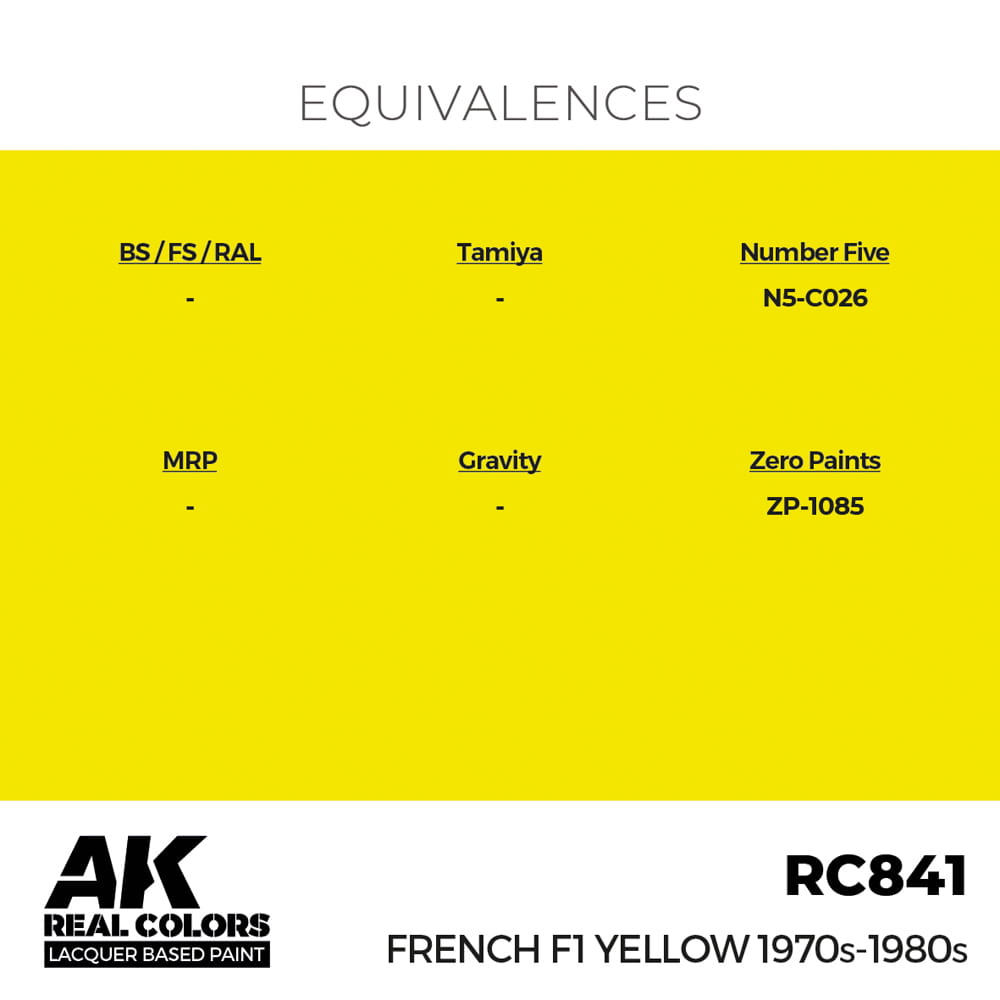 Farba akrylowa na bazie rozpuszczalników organicznych firmy AK Interactive seria Real Colors - kolor RC841 French F1 Yellow 1970s-1980s - Francuski żółty F1.
