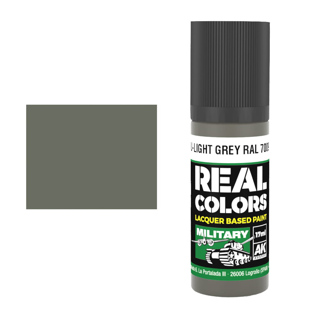 Farba akrylowa na bazie rozpuszczalników organicznych firmy AK Interactive seria Real Colors - kolor RC854 Hellgrau - Light Grey RAL 7009 Interior color - Jasny szary do wnętrz.