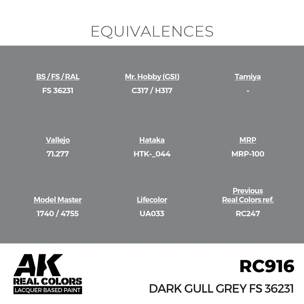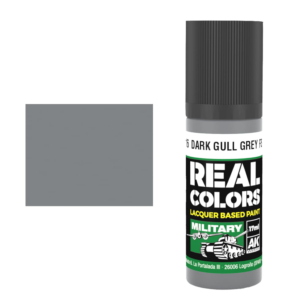 Farba akrylowa na bazie rozpuszczalników organicznych firmy AK Interactive seria Real Colors - kolor RC916 Dark Gull Grey FS 36231 - Ciemny szary mewi.
