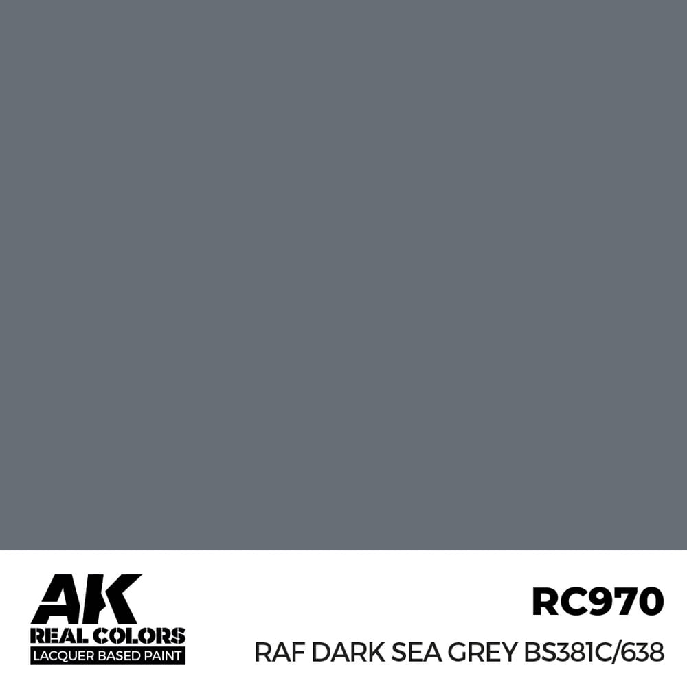 Farba akrylowa na bazie rozpuszczalników organicznych firmy AK Interactive seria Real Colors - kolor RC970 RAF Dark Sea Grey BS381C/638 - Brytyjski ciemny morski szary.