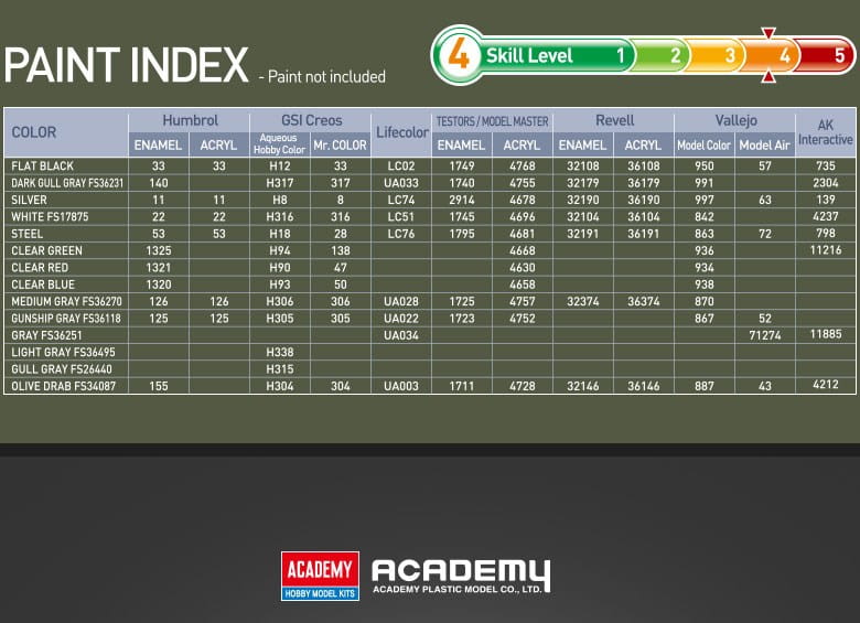 Produkują szeroką gamę modeli lotniczych, pancernych i okrętów w najpopularniejszych skalach. Coraz większą popularność w ich ofercie zyskują modele, które można składać bez użycia kleju, a także takie, które są produkowane z różnokolorowego plastiku i nie wymagają malowania po złożeniu. W typowych modelach redukcyjnych, które należy skleić i pomalować ilość części jest średnia, detale i pasowność bardzo dobre - modele Academy są dobrym wyborem dla każdego modelarza.