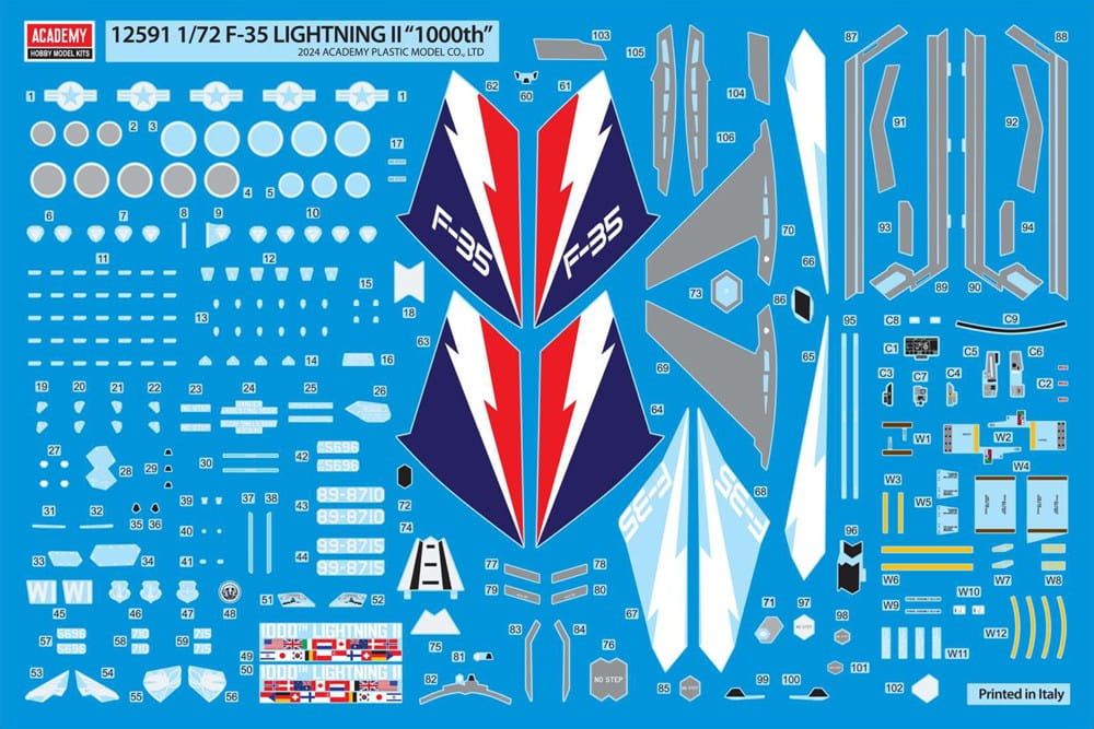 Academy 12591 to szczegółowy model samolotu wielozadaniowego F-35A Lightning II w skali 1:72, w specjalnej wersji z okazji wyprodukowania tysięcznego egzemplarza przez firmę Lockheed Martin. F-35A to wariant konwencjonalnego startu i lądowania, używany przez siły powietrzne wielu krajów NATO. Model zawiera elementy odwzorowujące charakterystyczną geometrię stealth oraz kalkomanie przedstawiające maszynę w jubileuszowym malowaniu.