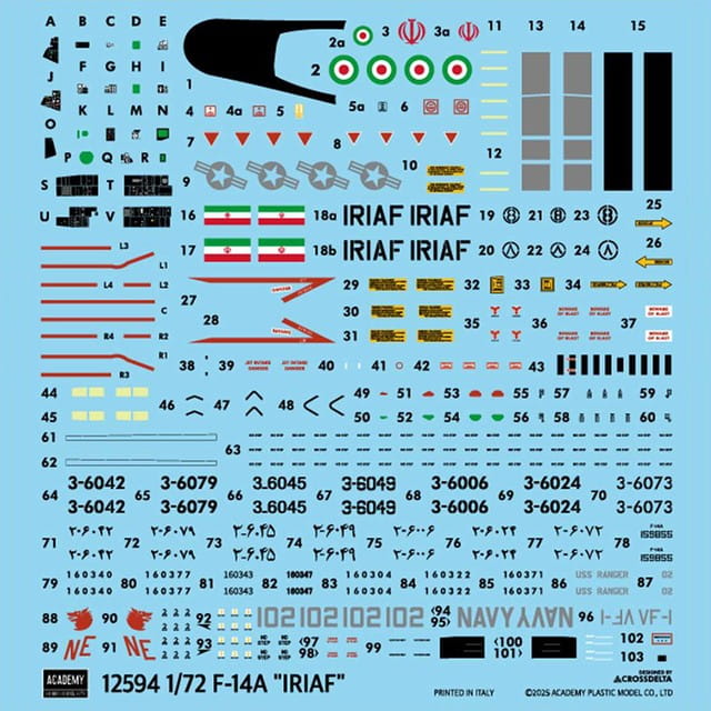 Academy 12594 przedstawia model słynnego amerykańskiego myśliwca pokładowego F-14A Tomcat w barwach irańskich sił powietrznych (IRIAF). Samoloty tego typu zostały dostarczone do Iranu jeszcze przed rewolucją islamską i pozostają jednymi z najbardziej charakterystycznych maszyn używanych przez to państwo. F-14A wyróżnia się zmienną geometrią skrzydeł oraz dużym zasięgiem i skutecznością w roli myśliwca przechwytującego.