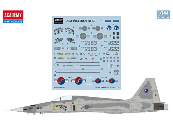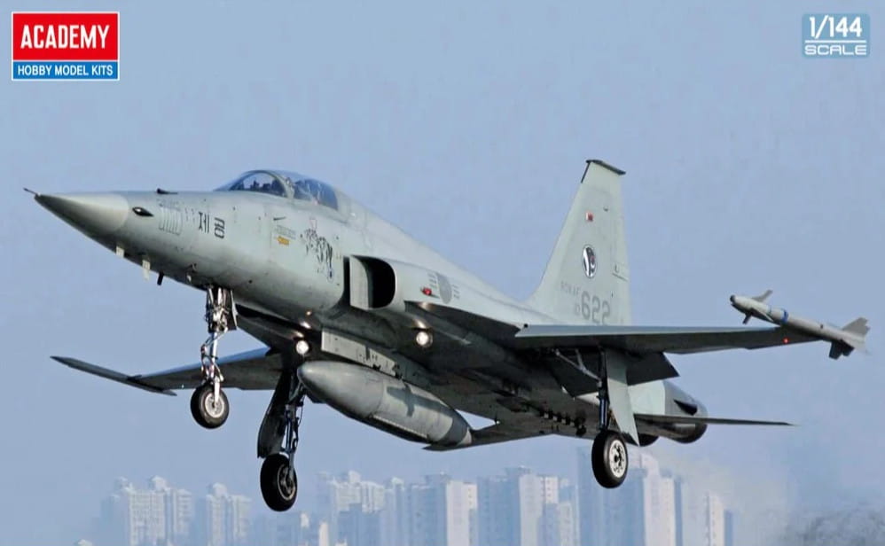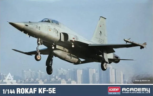 Academy 12644 przedstawia model południowokoreańskiego myśliwca KF-5E, będącego lokalnie produkowaną wersją znanego samolotu Northrop F-5E Tiger II. Maszyny te były wykorzystywane przez Siły Powietrzne Republiki Korei (ROKAF) jako lekkie myśliwce wielozadaniowe, przeznaczone do zadań przechwytujących i wsparcia taktycznego. Konstrukcja KF-5E łączy prostotę obsługi z dobrymi osiągami i wysoką niezawodnością.
