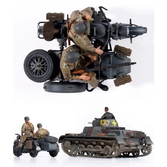 Zestaw modeli plastikowych do sklejania niemieckiego czołgu lekkiego Panzer I i motocykla z wózkiem bocznym.