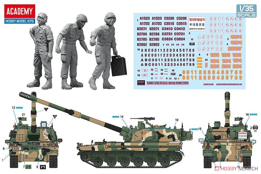 Academy 13561 to wysokiej jakości model południowokoreańskiej armatohaubicy samobieżnej K9A1 Thunder w skali 1:35. Pojazd ten stanowi zmodernizowaną wersję popularnego systemu artyleryjskiego K9, produkowanego przez firmę Hanwha Defense. K9A1 wyróżnia się ulepszonym systemem kierowania ogniem, automatyzacją systemów i zwiększoną ergonomią dla załogi. Model oferuje odwzorowanie licznych detali zewnętrznych i wewnętrznych, w tym wieży, zawieszenia oraz uzbrojenia.