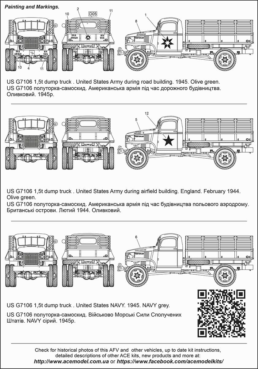 Zestaw Ace 72600 przedstawia amerykańską wojskową ciężarówkę G7106 o ładowności 1,5 tony z napędem na cztery koła, wykorzystywaną podczas II wojny światowej. Pojazd należał do rodziny ciężarówek serii G506 produkowanych przez firmę Chevrolet i stanowił jeden z najczęściej używanych środków transportowych US Army.