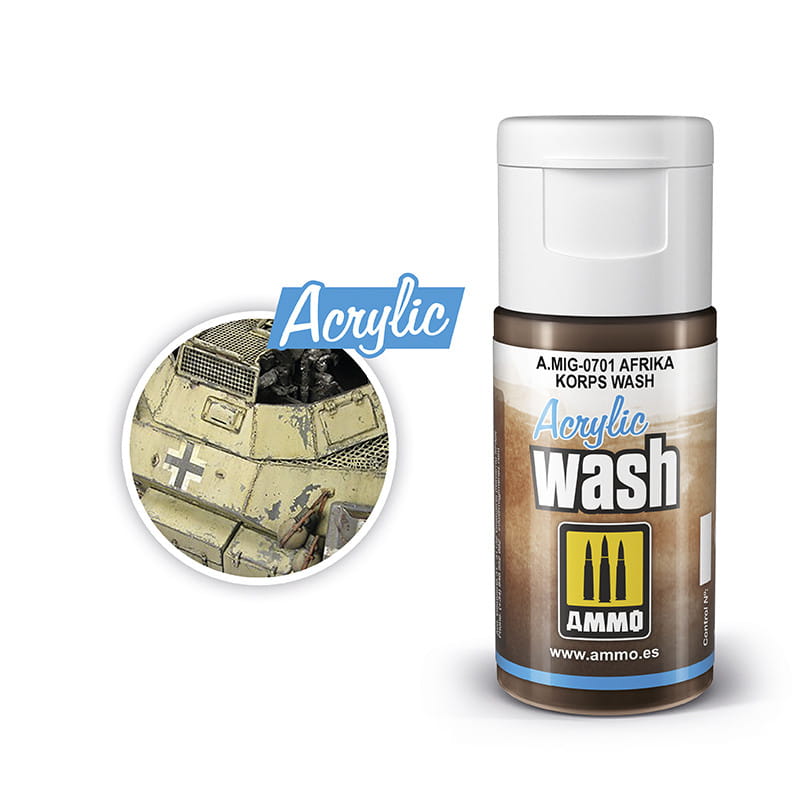 Washe Ammo Mig zostały opracowane w oparciu o dwie różne formuły, obejmujące zarówno emalie, jak i akryle. Każdy typ ma inne właściwości, aby dostosować się do różnorodnych potrzeb naszych modeli i preferencji każdego modelarza. Oba oferują doskonałe rezultaty i są bardzo łatwe w aplikacji. Zaletą akrylowych washy jest brak toksyczności i nieprzyjemnego zapachu, dzięki czemu używanie go w domu lub w pobliżu rodziny nie stanowi problemu. Charakteryzują się też szybszym schnięciem niż w przypadku washa olejnego, co ma swoje dobre strony bo pozwala szybko uzyskać oczekiwany efekt i przejść do kolejnych etapów pracy z modelem, ale wymaga większych umiejętności. Szybkie schnięcie powoduje że mamy bardzo mało czasu na ewentualne poprawki czy całkowite zmycie nałożonego płynu.