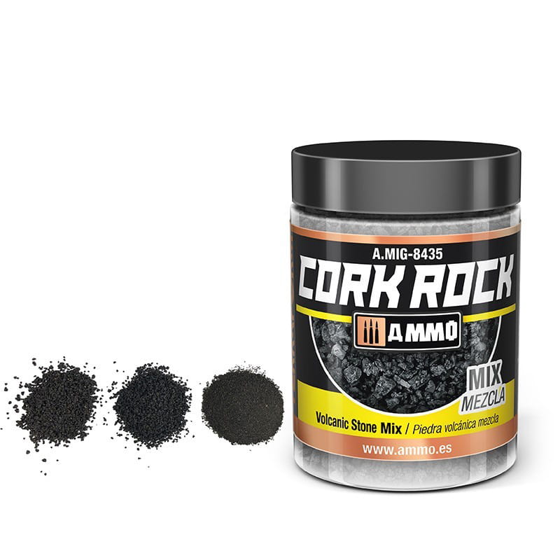 Posypka wykonana z wysokiej jakości barwionego granulatu korkowego w kolorze czarnym do odwzorowania kamieni i gruzu na obszarach wulkanicznych. Dostępna w trzech różnych rozmiarach lub mieszance trzech gradacji, aby lepiej dopasować się do potrzeb każdego modelarza. Gotowy do użycia od razu po wyjęciu z opakowania. Pokruszone kawałki korka można mocować za pomocą wszelkiego rodzaju klejów do drewna, klejów do makiet lub klejów akrylowych i cyjanoakrylowych.