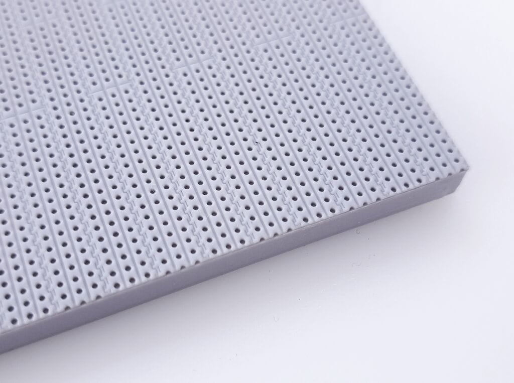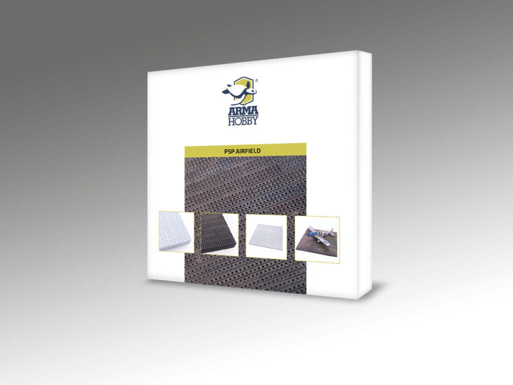 Plastikowa podstawka pod model samolotu w skali 1/72 precyzyjnie odwzorowująca powierzchnię lotniska pokrytą panelami PSP („Marston Mat”).