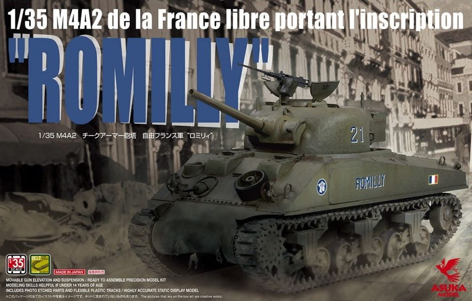 Asuka 35037 to szczegółowy model plastikowy w skali 1:35 przedstawiający czołg średni M4A2 Sherman używany przez jednostki Wolnej Francji w końcowym okresie II wojny światowej. Zestaw umożliwia odtworzenie historycznego pojazdu noszącego nazwę własną „Romilly”, typową dla francuskich Shermanów, które często oznaczano nazwami miejscowości lub bitew.