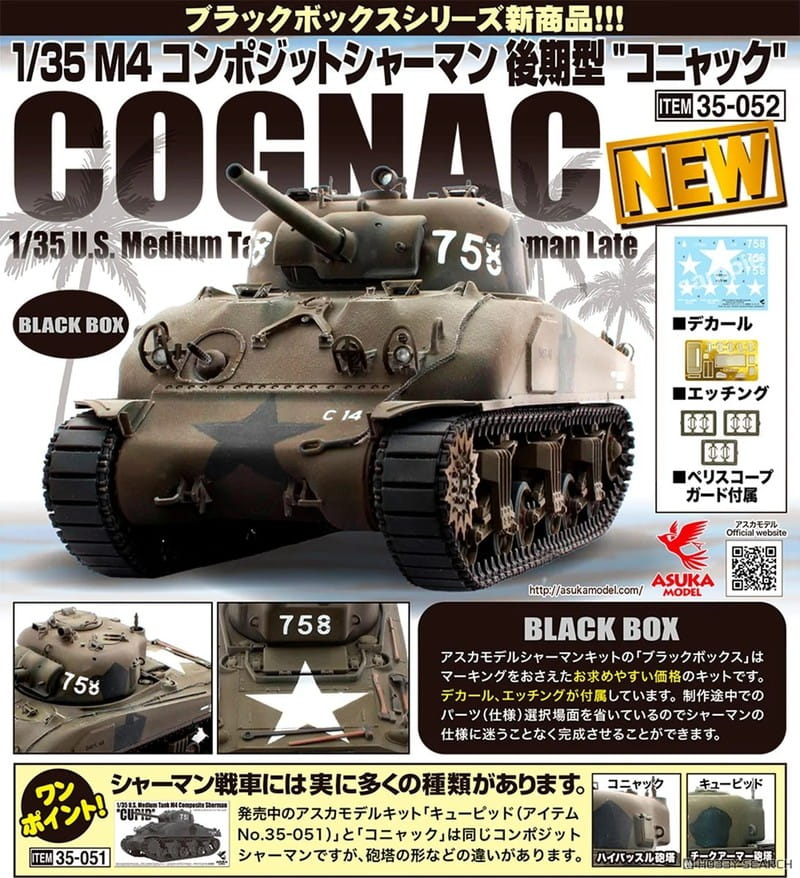 Asuka 35052 to wysokiej klasy model plastikowy w skali 1:35 przedstawiający amerykański czołg średni M4 Composite Sherman w późnej konfiguracji produkcyjnej. Wariant Composite wyróżniał się nietypowym kadłubem, który łączył przednią część odlewaną z tylną częścią spawaną – rozwiązanie stosowane przejściowo w czasie intensywnej produkcji Shermanów podczas II wojny światowej.