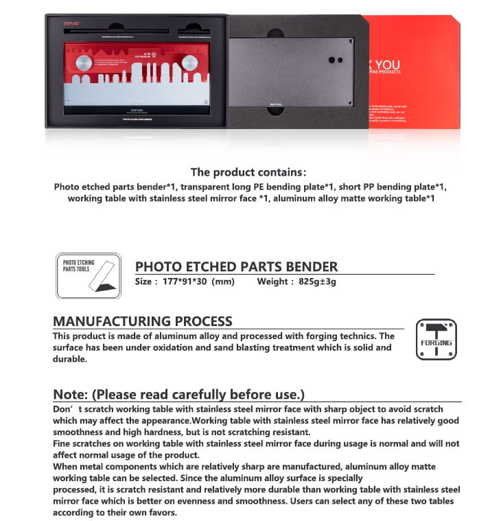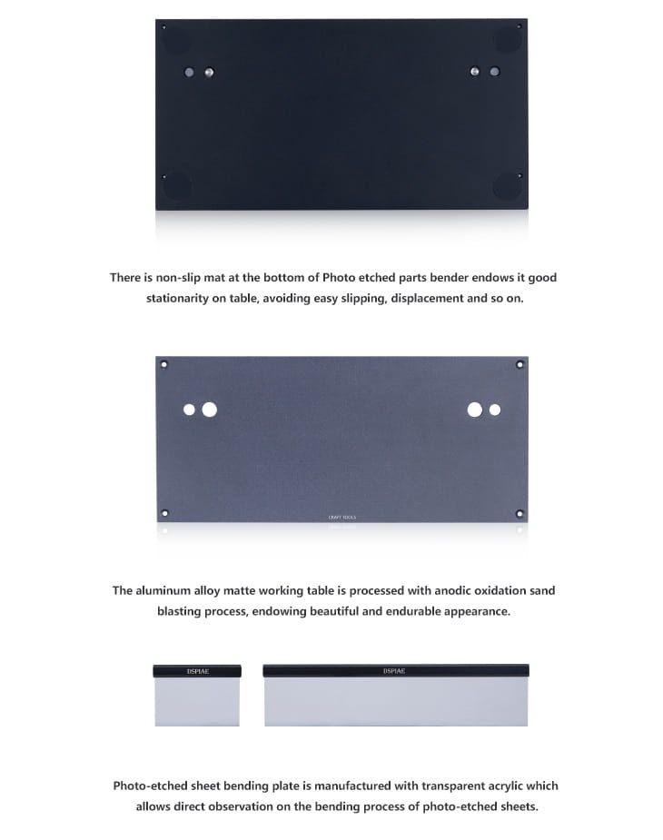 Wysokiej jakości zaginarka do elementów fototrawionych. Element należy włożyć pomiędzy dwie części zaginarki i dokręcić śruby dociskowe. Posługując się załączonym ostrzem zaginamy element. Należy zwrócić uwagę żeby linia gięcia była dokładnie na krawędzi zaginarki. Boczne wytłoczenia na górnej części zaginarki możemy użyć do wyginania małych elementów do różnych kształtów.