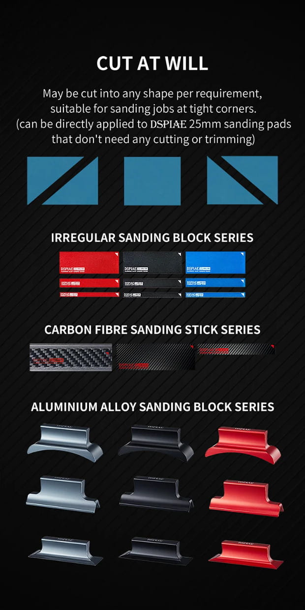 Samoprzylepne papiery ścierne DSPIAE o zestandaryzowanym wymiarze 25x75mm do użycia z szeroką gamą ich bloczków ściernych. Można je dowolnie docinać dopasowując do mniejszych narzędzi. Każdy arkusik posiada odpowiednio mocny klej, który jednak nie pozostawia śladów podczas odrywania od bloczka do szlifowania. Równomierne napylenie środka ściernego zapewnia delikatniejsze wykończenie powierzchni. Może być używany zarówno na sucho, jak i na mokro. Każda gradacja ma inny kolor membrany podkładowej dla łatwiejszej identyfikacji.