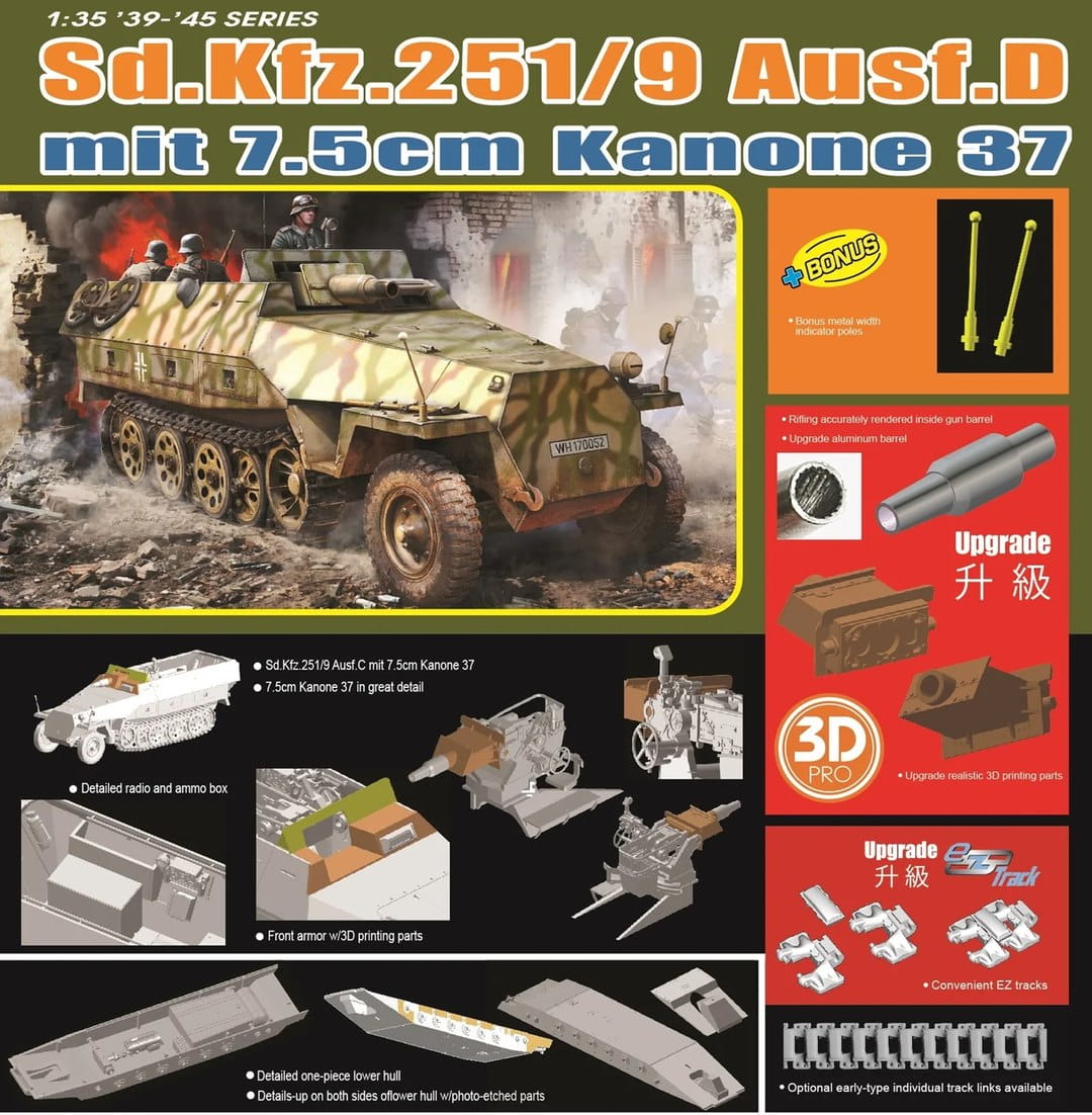 Dragon 6516 to wysokiej jakości model niemieckiego półgąsienicowego transportera opancerzonego Sd.Kfz. 251/9 Ausf. D, znanego jako „Stummel”. Pojazd ten uzbrojono w krótkolufową armatę 7,5 cm KwK 37, co pozwalało mu pełnić rolę wsparcia ogniowego w jednostkach grenadierów pancernych. Wersja Ausf. D była uproszczona konstrukcyjnie, co ułatwiało jej produkcję i masowe użycie na froncie.