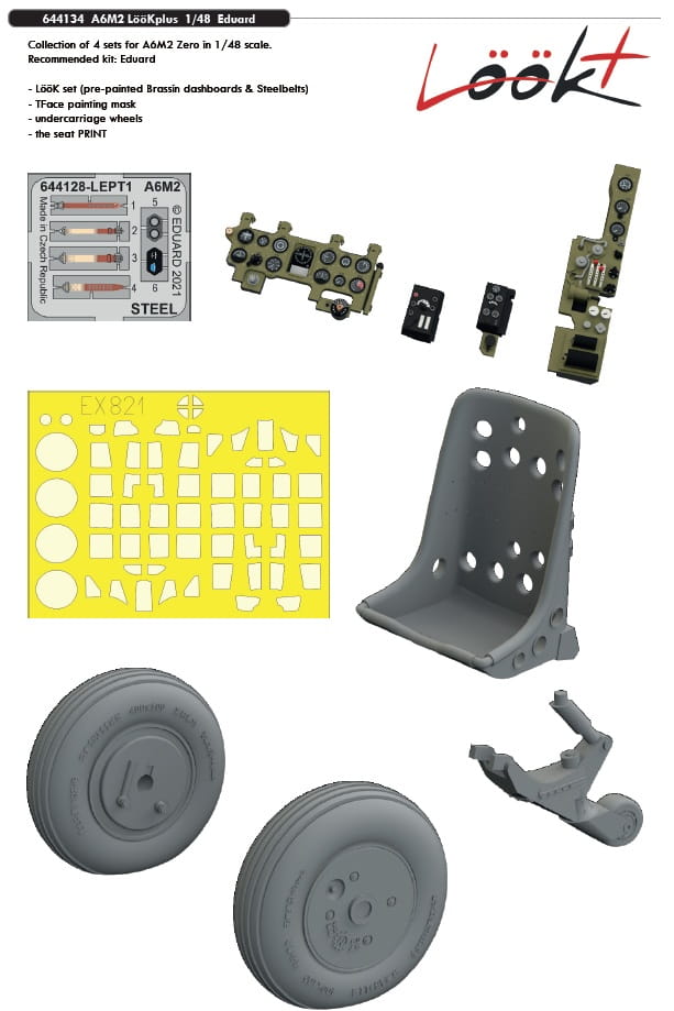 Zestaw elementów żywicznych, fototrawionych i masek z serii LöökPlus samolotu A6M2 Zero w skali 1/48.