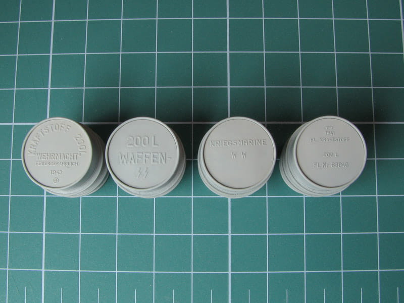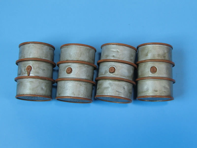 Zestaw 4 żywicznych odlewów metalowych, niemieckich beczek na paliwo używanych w okresie II wś. W zestawie znajdują się elementy fototrawione umożliwiające oznaczenie beczek przydzielonych do sił Kriegsmarine, SS i Wehrmachtu.