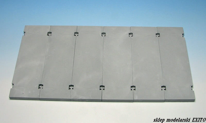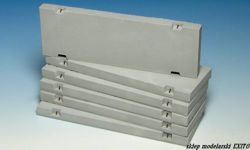 Opakowanie zawiera 6 płyt odlanych z twardego gipsu, barwionych na kolor betonu. Wariant o wymiarze płyty 85,7 x 28,5 mm z oczkami transportowymi zatopionymi w wycięciach na dłuższych bokach płyty.