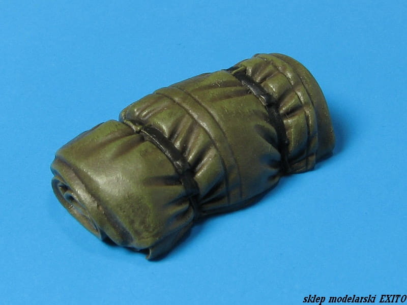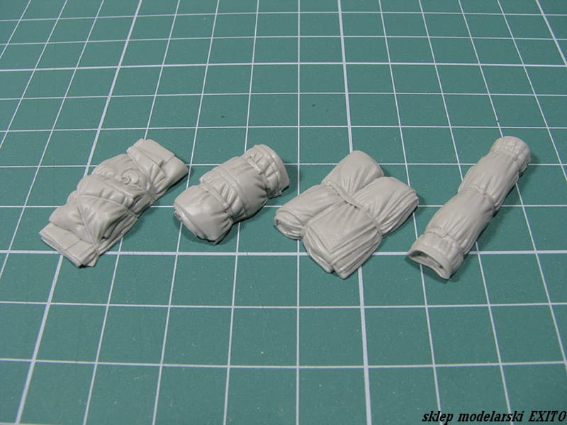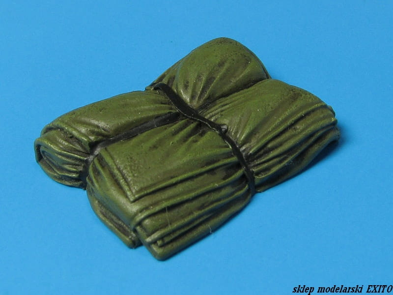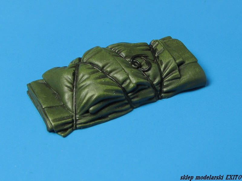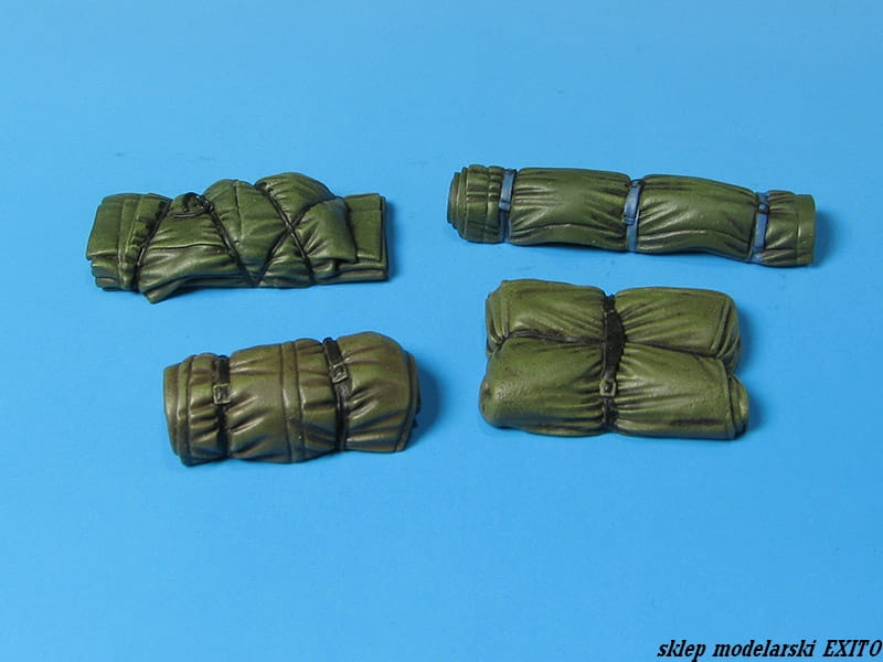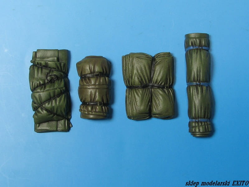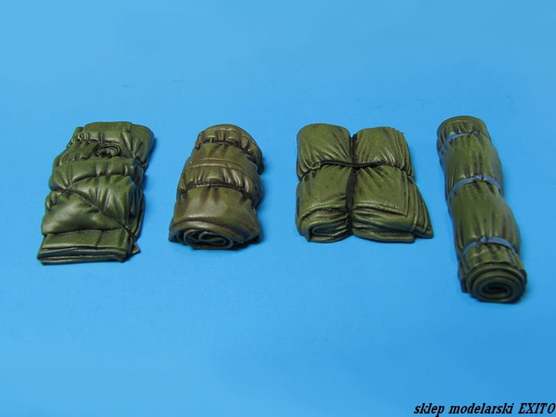Opakowanie zawiera 4 elementy żywiczne - złożone pakunki, mogące reprezentować różnego rodzaju plandeki i płachty materiału, które są świetnym dodatkiem na pojazdy pancerne z dowolnego okresu historycznego, winiety, dioramy itp.