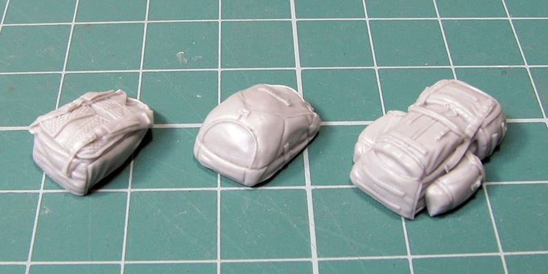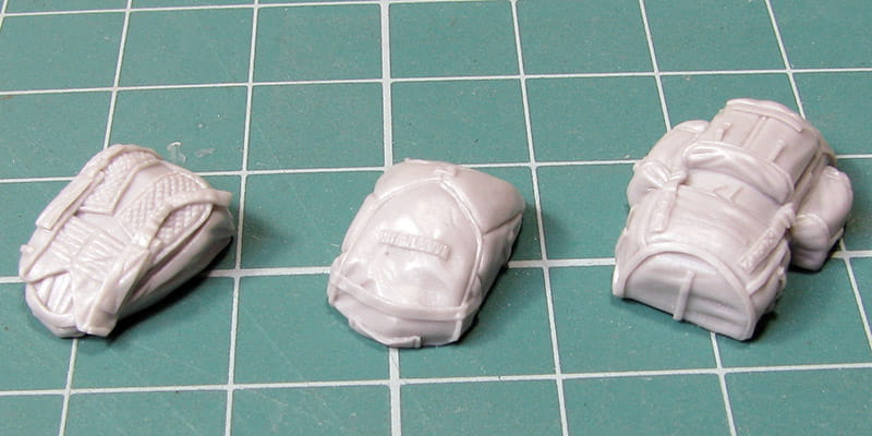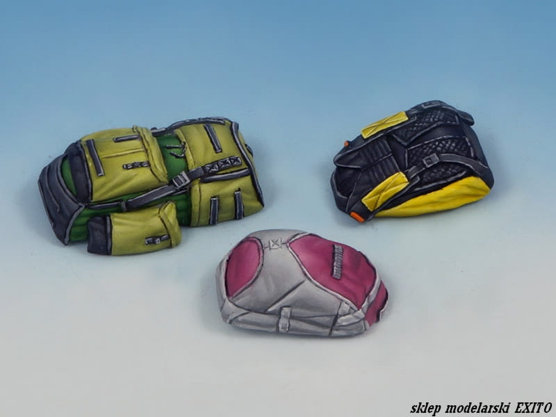 Opakowanie zawiera 3 żywiczne odlewy współczesnych plecaków.
