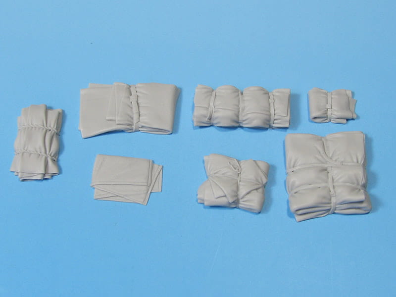 Opakowanie zawiera 7 elementów żywicznych - złożonych pakunki, które mogą reprezentować różnego rodzaju plandeki i płachty materiału będące świetnym dodatkiem na pojazdy pancerne z dowolnego okresu historycznego, winiety, dioramy itp.