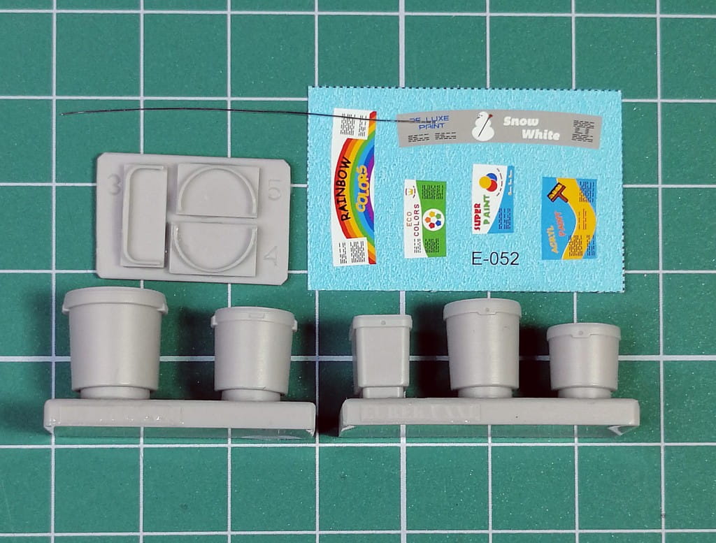 Zestaw zawiera komplet elementów żywicznych do wykonania 5 plastikowych wiaderek na farbę w różnych rozmiarach i kształtach oraz arkusz kalkomanii z etykietami do nich.