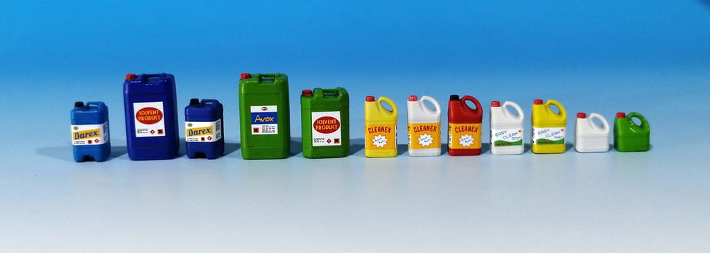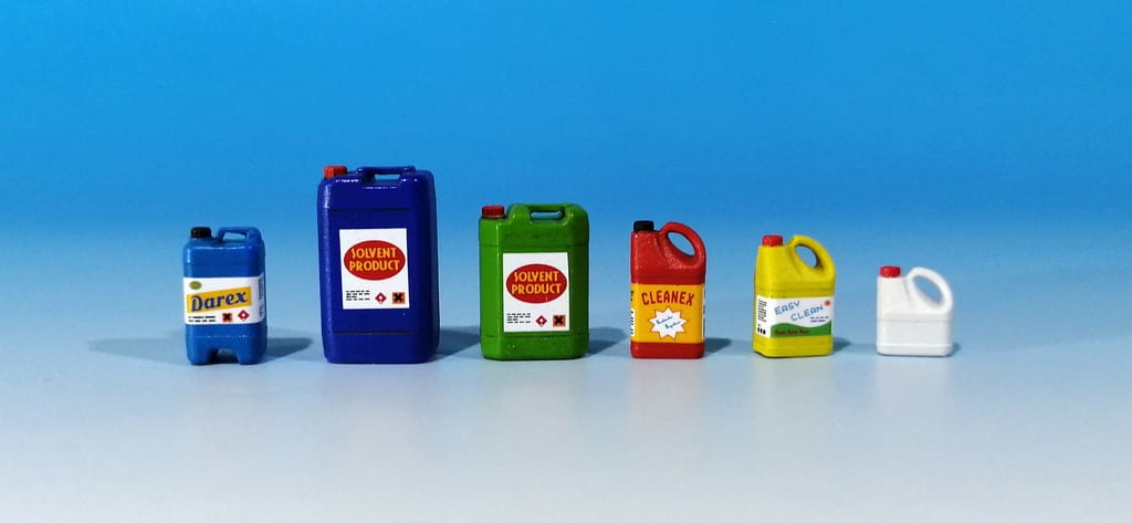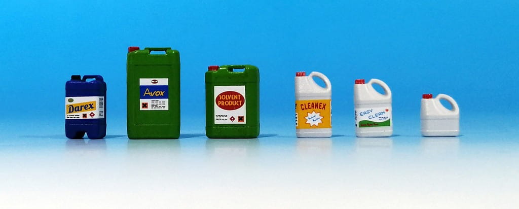 Zestaw 6 odlanych z żywicy plastikowych pojemników na chemikalia, środki czyszczące itp. W zestawie arkusz kalkomanii z etykietami do pojemników.