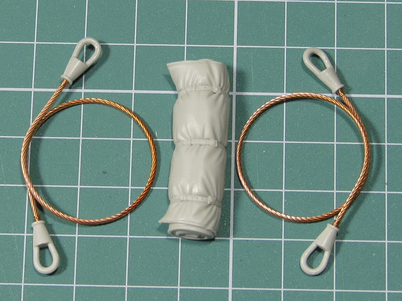 Zestaw plecionych, miedzianych lin oraz ich żywicznych zakończeń do modeli czołgów T-44 w skali 1/35.
