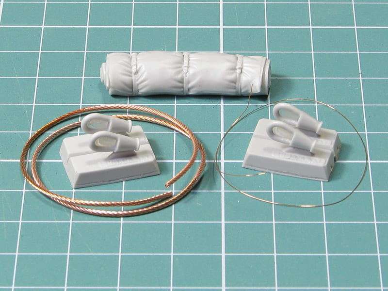 Zestaw plecionej liny mosiężnej i żywicznych zakończeń, którym można zastąpić części modelu plastikowego.