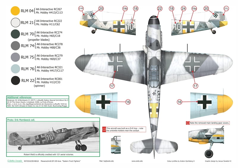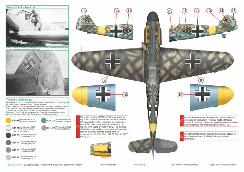 Zestaw kalkomanii zatytułowany “Eastern Front Fighters” zawiera oznaczenia dla trzech różnych wariantów Messerschmitta Bf 109, które służyły jako osobiste maszyny czołowych asów frontu wschodniego: