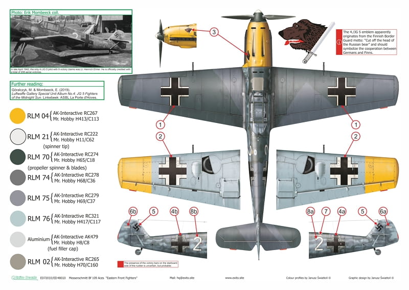 Oznaczenia dla przedstawionych tu samolotów Ehrlera i Weißa nie były dotychczas dostępne w formie kalkomanii, zaś maszyna Golloba nie została potraktowana z wystarczającą uwagą przez wytwórcę, który próbował się z nią zmierzyć. Według naszej wiedzy jest to pierwszy na rynku zestaw kalkomanii zawierający godło 4./JG 5 (w tym bonusowy egzemplarz). W instrukcji umieszczono zdjęcia archiwalne każdego z przedstawionych samolotów.
