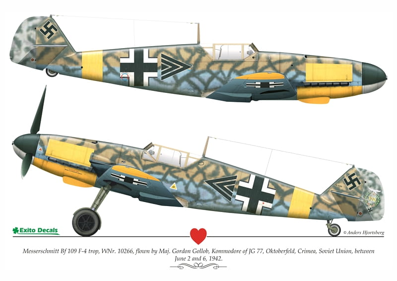 - Messerschmitt Bf 109 F-4 trop, WNr. 10266, pilot: Maj. Gordon Gollob, dowódca JG 77, Oktoberfeld, Krym, ZSRR, między 2 i 6 czerwca 1942 roku.