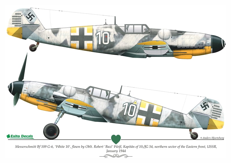 - Messerschmitt Bf 109 G-6, ‘biała 10’, pilot: Oblt. Robert ‘Bazi’ Weiß, dowódca 10./JG 54, polnocny sektor frontu wschodniego, ZSSR, styczen 1944 roku.