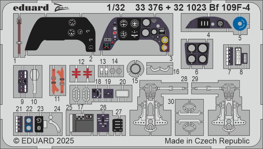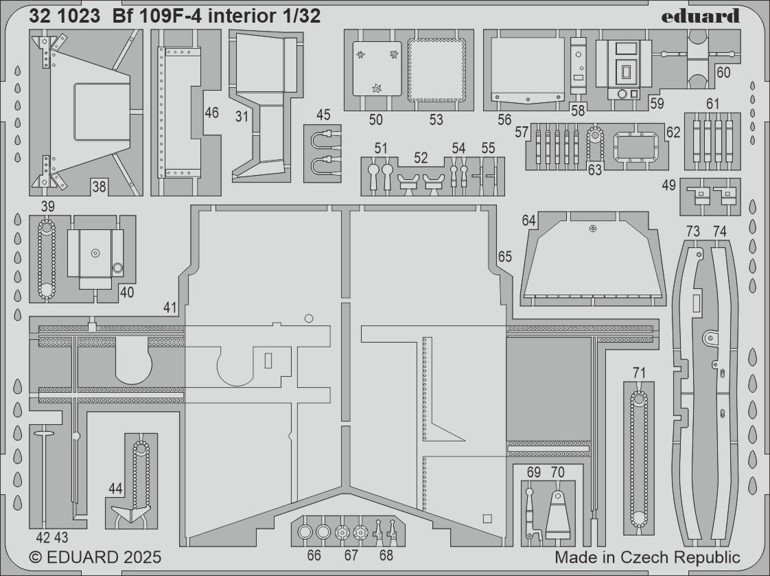 Zestaw elementów fototrawionych do modelu samolotu Bf 109F-4 w skali 1/32.