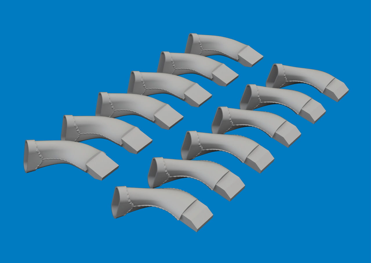 Rury wydechowe, wydruki 3D do modelu samolotu Spitfire Mk.VIII w skali 1/24.