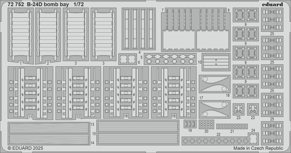 Zestaw Eduard 72752 został opracowany z myślą o modelu samolotu B-24D Liberator firmy Airfix w skali 1:72. Zawiera komplet fototrawionych elementów przeznaczonych do komory bombowej, umożliwiających szczegółowe odwzorowanie jej konstrukcji, podziału wewnętrznego oraz wyposażenia. W zestawie znajdują się panele, żebrowanie, prowadnice i detale instalacji, które pozwalają uzyskać efekt realistycznego, otwartego przedziału bombowego.