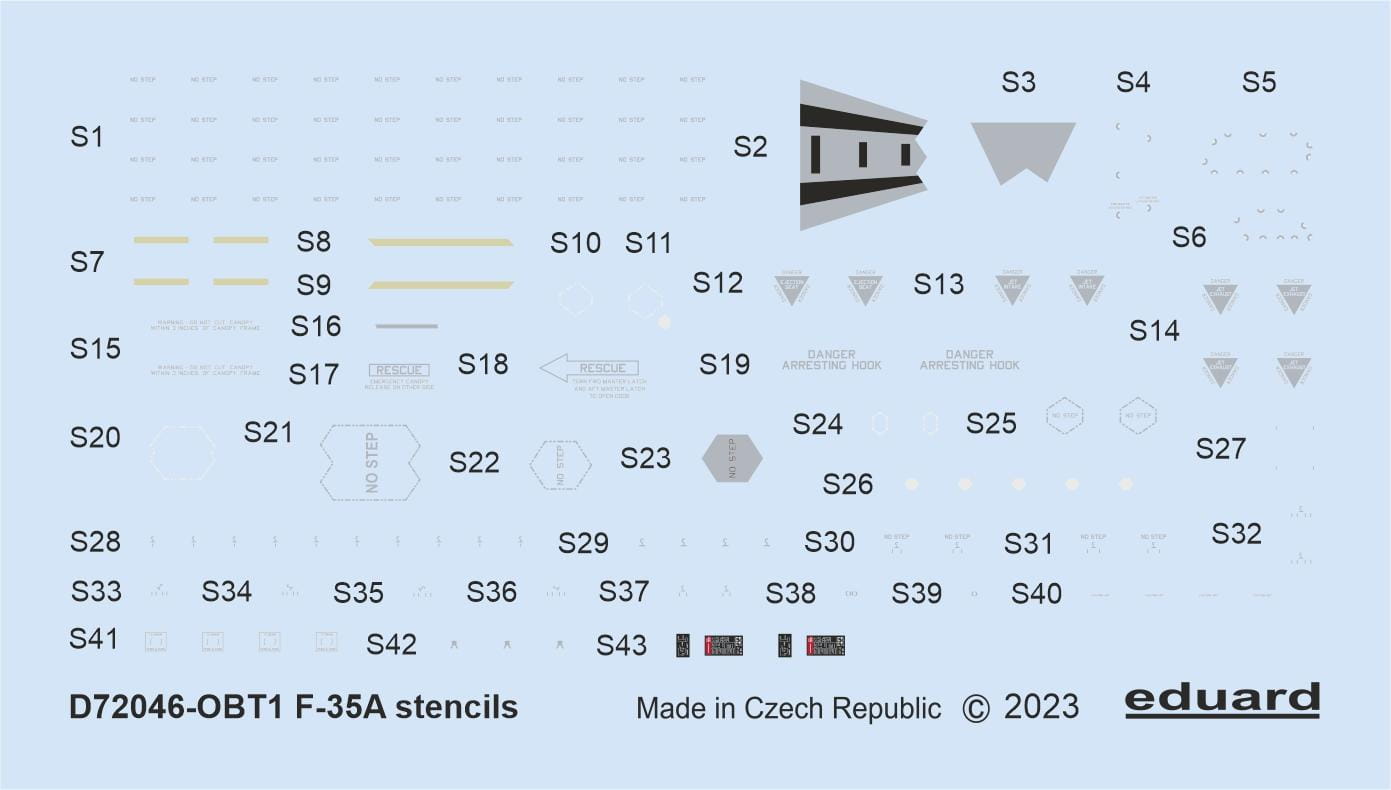 Kalkomania do modeli plastikowych, napisy ekspoloatacyjne do modelu samolotu F-35A w skali 1/72.