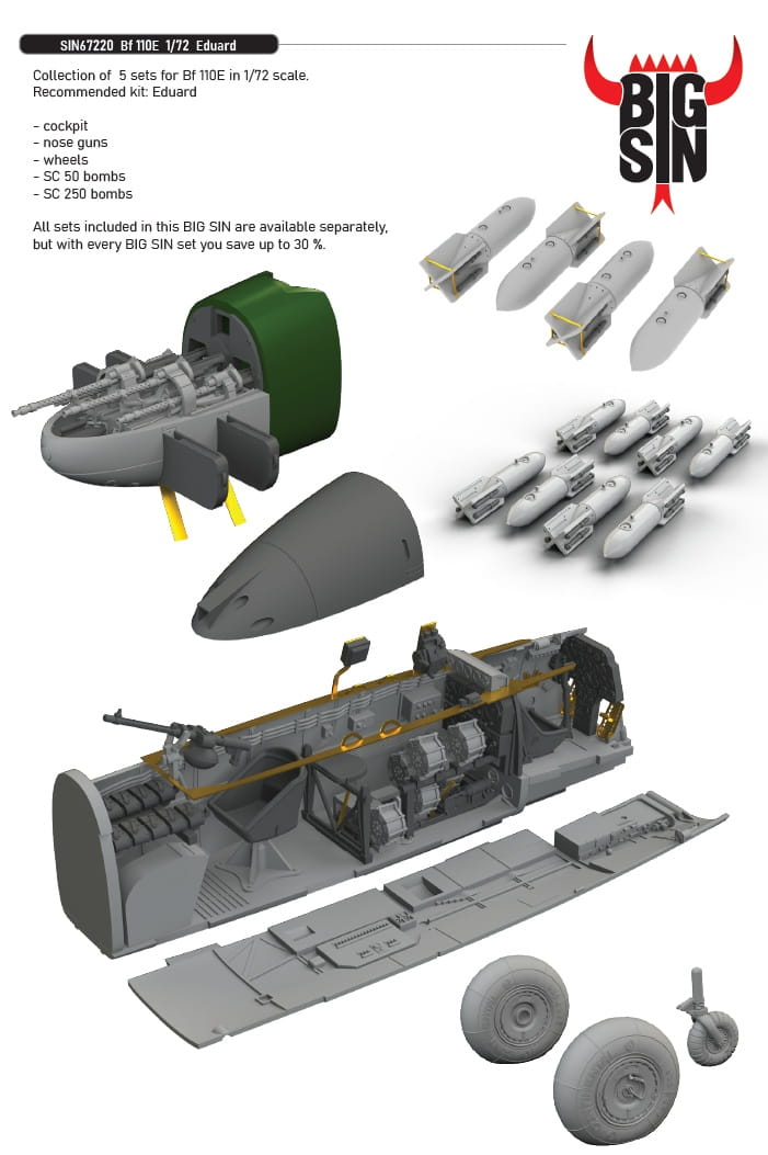 Zestaw elementów żywicznych i fototrawionych z serii Big Sin do modelu samolotu Bf 110E w skali 1/72.