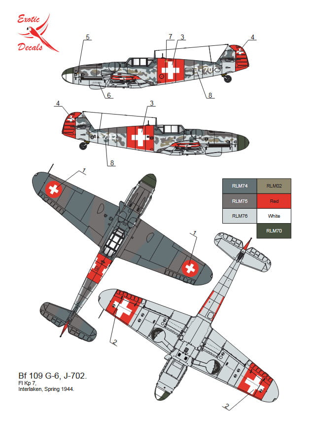 Pierwsza część serii „Swiss Gustavs Over Alps” od Exotic Decals w skali 1:32 zawiera kalkomanie do trzech samolotów Messerschmitt Bf 109G-6 należących do szwajcarskich sił powietrznych. Maszyny te, mimo że pierwotnie niemieckie, służyły w neutralnej Szwajcarii podczas II wojny światowej, chroniąc jej przestrzeń powietrzną.